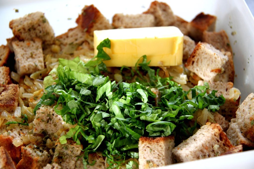 Das Brot in Würfel schneiden und mit den Gewürzen mischen, dann die Milch und den Sekt darüber giessen und so das Brot einweichen lassen. Unterdessen die Zwiebeln und den klein geschnittenen Speck mit dem 1 EL Butter glasig braten. Das nun mit der gehackten Petersilie und der weichen Butter zu den eingeweichten Brotwürfeln geben. Ich habe alles mit der Küchenmaschine verkneten lassen, um eine homogene Masse zu erhalten. Dann die Eigelbe zufügen und mit kneten. Nun die Eiweisse steif schlagen und unter die Masse ziehen.