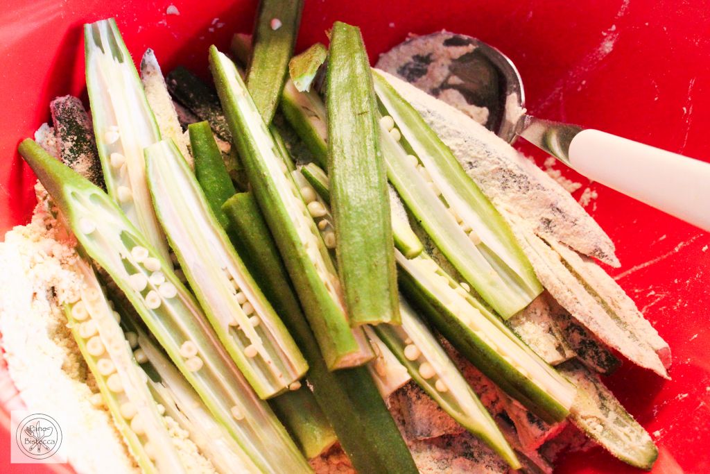 Die Enden der Okras abschneiden, dann die Okras der Laenge nach in halb, oder wenn sie sehr dick sind, in Drittel schneiden. Ich habe sie leicht ausgeschüttelt, damit sich nicht zu viele Samen mit dem Mehl vermischen. Die geschnittenen Okras mit der Mehlmischung mischen.