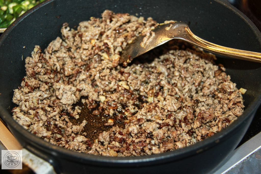 Die Zwiebel und die Knoblauchzehen in wenig Oel knusprig braten, dann das Hackfleisch zugeben und alles gut durchbraten. Gut würzen!