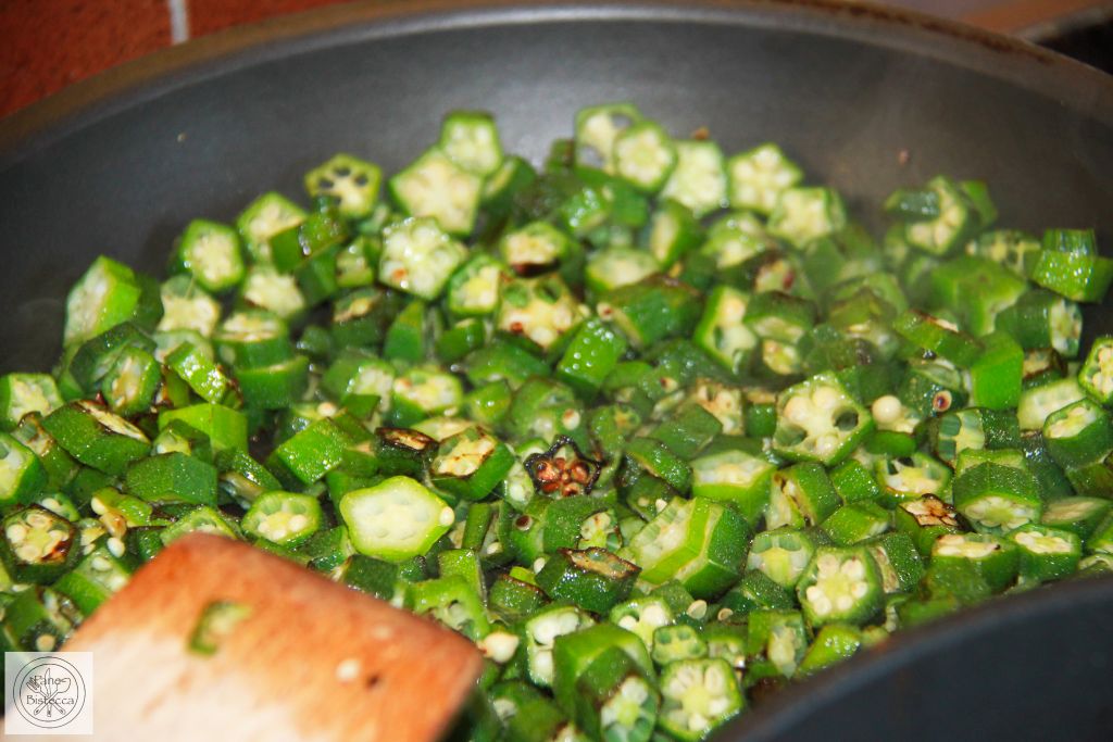 Unterdessen die Okra waschen und in schmale Scheiben schneiden, dann in einer separaten Bratpfanne mit wenig Oel knusprig braten.