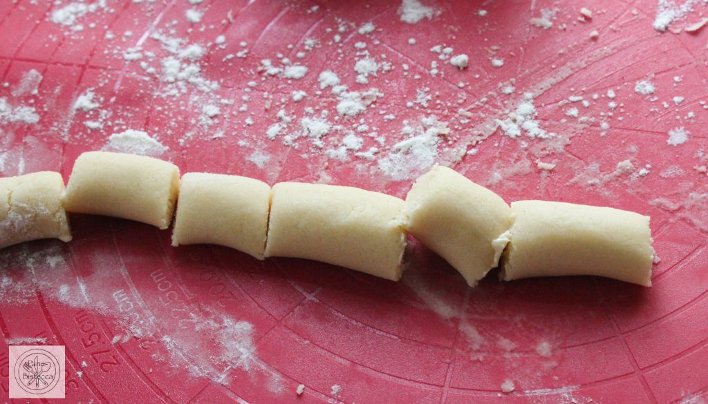 Alle Zutaten zum Teig zusammen kneten und daraus Fingerdicke Rollen formen. Diese Rollen in ca. 2 cm lange Stücke schneiden und diese Stücke zu Kugeln rollen.