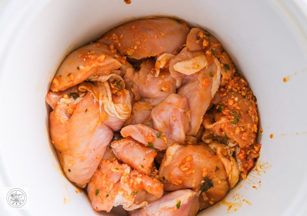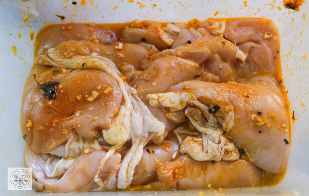 Die Zutaten für die Marinade zusammen mischen und die Hühnerbrüste darin über Nacht marinieren.
