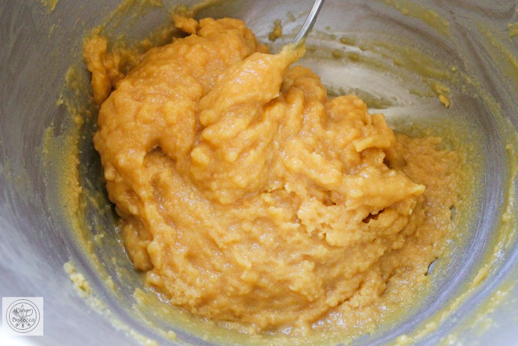 Die Zutaten für den Guss mit der Kuchenmaschine gut verkneten. Dann auf den vorgebackenen Teig streichen.