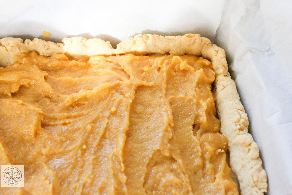 Die eingefettete Back Form mit dem Kuchenteig auslegen, Seiten hochziehen. Dann im Ofen bei 180 C Grad 20 Minuten blindbacken.