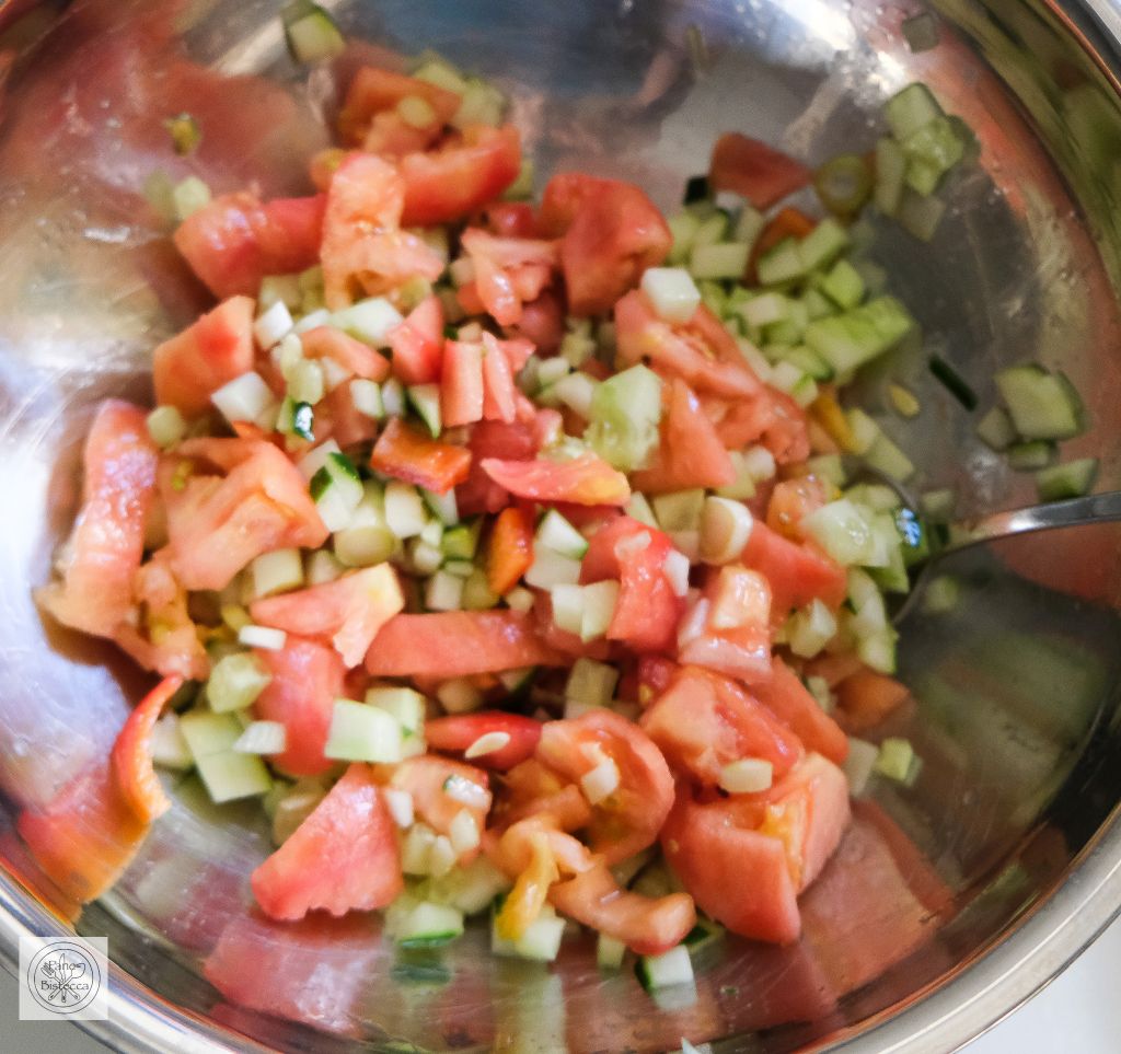 ¼ Der Gurke in ganz kleine Würfel schneiden, ¼ einer Tomate auch in kleine Würfel schneiden, beides in einem Schüsselchen vermischen und zur Seite geben für die Dekoration.